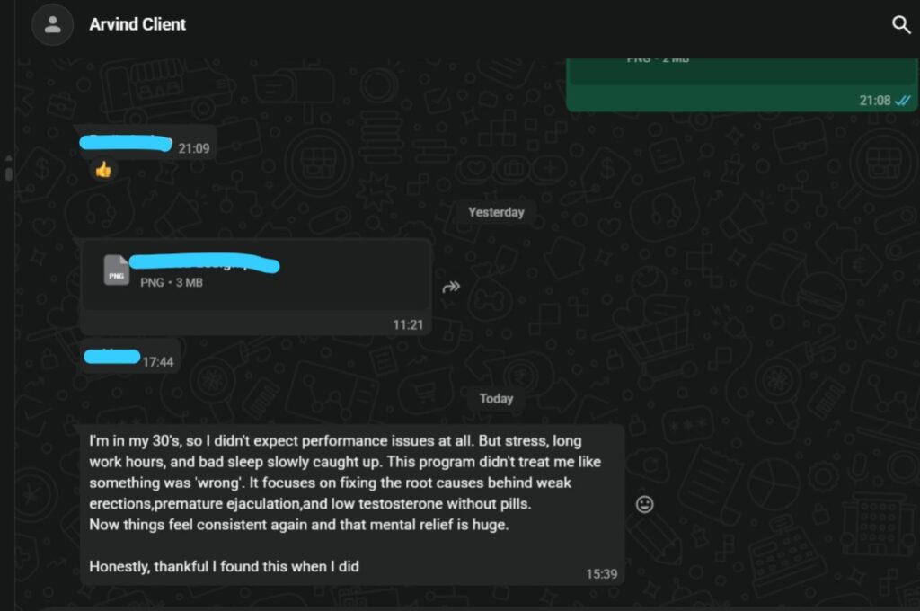 After a few weeks of following his guidance, I noticed a real change. My energy levels improved, erections became stronger, and I felt mentally calmer. Today, I feel like I have regained my normal life and confidence again.