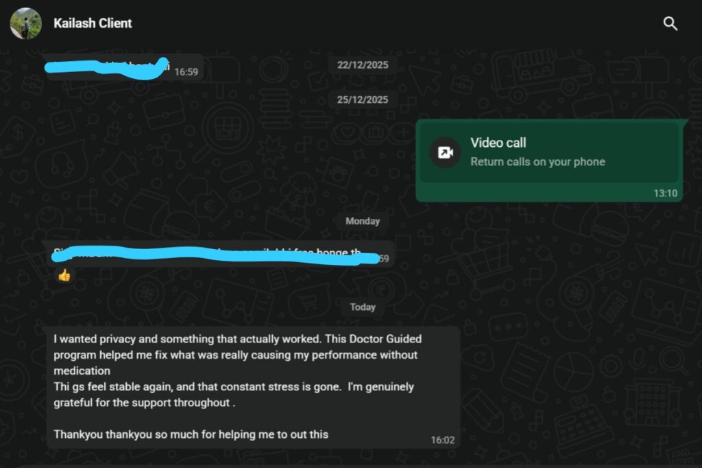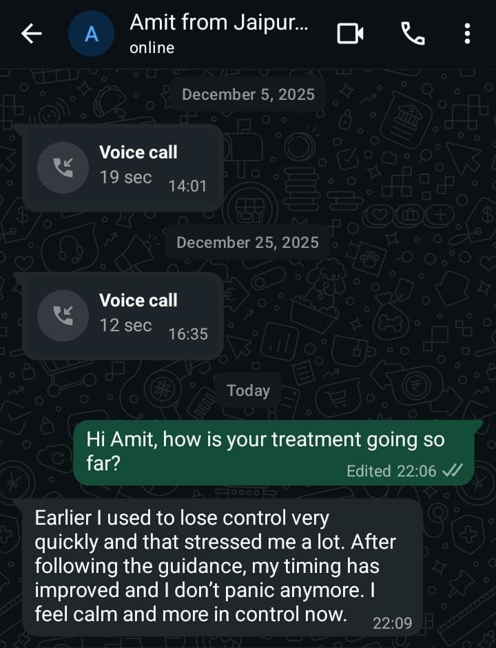 With time, I noticed that my mind was calmer and my control improved naturally. Now my timing is much better, and I don’t feel scared or pressured anymore. My confidence is back, and my relationship feels much healthier.